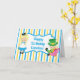 Cute Alice in Wonderland Happy Birthday card for a book themed birthday. Little girl Alice in her blue dress and the Mad Hatter in a teacup on a pretty blue border on a whimsical baby blue and yellow striped card. Customise with your own text for a children's tea party or bookworm.