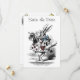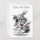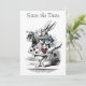 Our fun, off the wall Save the Date announcement card is designed with fans of the 1865 book Alice's Adventures in Wonderland by Lewis Carroll in mind. On the front of the card is an illustration of the white rabbit who is a herald at the court of the Queen of Hearts. The rabbit is wearing a tabard decorated with hearts as he blows on his little trumpet to make a very important announcement. On the other side of the card are illustrations of Alice and the Mad Hatter. Alice is looking at the bottle with the magic potion that will reduce her to just ten inches in height so that she can enter the beautiful garden. The Mad Hatter looks, well, ever so slightly eccentric! If you're a fan of Alice's Adventures in Wonderland, this is the perfect card to let your family and friends know the date of your upcoming wedding. You can easily customise the card to suit the occasion eg engagement party, bridal shower, with your date and the bride and groom's name. Just press the customise button to change the text. The original illustrations are by John Tenniel. We've added selective colouring to the white rabbit's bow and the heart shapes on his costume.