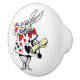 Alice in Wonderland character, the white rabbit with his trumpet, scroll, and wearing his robe with red and black hearts. Fun fairy tale theme.