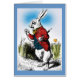 This fun greetings card for fans of the 1865 book Alice's Adventures in Wonderland by Lewis Carroll features the famous illustration of the white rabbit looking at the watch from his waistcoat pocket. 'Oh dear! Oh dear! I shall be too late!' he cries. He's late for his shift as herald at the court of the Queen of Hearts. I think the reason he's always late is that he's a slave to fashion. Just look at that outfit! Whether it's to say congratulations on a birthday, wedding anniversary, engagement or just to say thank you or hi, or even sorry for being late sending it, the card would suit lots of occasions. The original black and white drawing is by John Tenniel. I've added a dash of colour to the scene. You can change the colour background to suit by using the customise button, also add your own message on the inside.