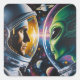 Alien and astronaut in space doing a stare down. Background of stars and planets.