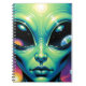 Extraterrestrial notebook. A captivating otherworldly design with an extraterrestrial alien being with big bulging eyes holding the reflections of other planets, including earth in them.