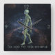 Fun space themed wall clock, with graphic artwork of a green alien wearing colourful galaxy sunglasses, against an abstract solar system looking background. Custom text reads Too cool for this universe, and can be personalised to read what you want.