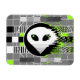 ATTENTION EARTHLINGS! Cool retro TV testcard inspired design featuring a stylised alien face and extra-terrestrial interference in shades of black, white, grey and green. A customisable design for you to personalise with your own text, images and ideas. An original digital art image created by Jess Perry.