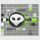 ATTENTION EARTHLINGS! Cool retro TV testcard inspired design featuring a stylised alien face and extra-terrestrial interference in shades of black, white, grey and green. A customisable design for you to personalise with your own text, images and ideas. An original digital art image created by Jess Perry.