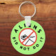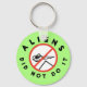 This keychain has a prohibitory traffic sign with a cartoonish flying saucer and a stylised pyramid on a white background, crossed by a red "forbidden" line. The sentence "aliens did not do it" in capital black letters runs all around the sign on a light green background.