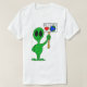 A cartoon drawing of a tiny green alien holding a sign that says how much aliens love Earth. What this alien isn't saying is that aliens love Earth because Earth has the best test subjects for experiments. A great shirt for Earth Day.