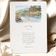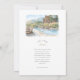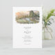 This two-sided destination wedding invitation features a fine-art watercolor illustration of the Alila Ventana Big Sur resort perched on the hillside above the California coast. The artwork captures an elevated view of the infinity-style pool, terraced decks, and modern cedar-clad buildings nestled among redwoods and rolling mountains at sunset. Soft washes of misty blue, warm gold, and muted green blend together in a loose, painterly style, while delicate ink outlines define the architecture and landscape, giving the design a relaxed yet luxurious feel.