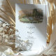 The coordinating back shows a closer poolside vignette with lounge chairs, stone decking, and lush plantings against a hazy mountain backdrop, paired with a “Finer Details” heading for your extra information. Clean serif typography and subtle script accents sit in generous white space beneath the artwork, keeping the overall look airy, modern, and elegant. All wording is fully customizable, making this suite perfect for Big Sur celebrations, coastal resort weddings, winery weekends, or any scenic mountain destination event.