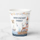 Celebrate your little boy or girl's birthday with this adorable custom ocean theme birthday party paper cup. Cup has a watercolor lighthouse, sailboat, whale, anchor, and island. The editable text says Happy Birthday and includes a spot for your little kid's name and age.