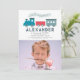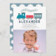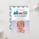 This cute "all aboard" boy's birthday photo invitation features a white background with steam train in blue and red. The reverse side features a sky blue background with cloud patterns. Personalise it for your needs. You can find matching products at my store.