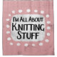 "I'm All About Knitting Stuff" is a cute text design in pink with black and red text, along with a white accent shape and white textured whimsical dots surrounding it.