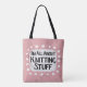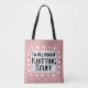 "I'm All About Knitting Stuff" is a cute text design in pink with black and red text, along with a white accent shape and white textured whimsical dots surrounding it.