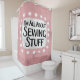 "I'm All About Sewing Stuff" is a cute text design in pink with black text, along with a white accent shape and white textured whimsical dots surrounding it.