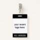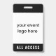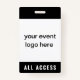 Customise this simple, modern all access event pass badge with your logo. If your logo is square, it will fill up the white space entirely. If your logo is not square, it will show on a black background. The back of the badge can be personalised with the event name and date or year, or you can delete both to have an all black back. This minimalist all access pass badge is ideal for various types of passes at special events, festivals, concerts and conventions. You can easily personalise the name of the pass if you like also.