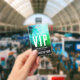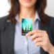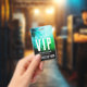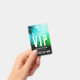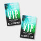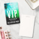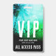 This VIP badge features a bold and energetic design, perfect for an outdoor concert or a party with a Coachella vibe. At the top, a vibrant mix of green and blue artwork shows silhouettes of concert-goers and a palm tree in the top left, capturing that lively festival feel. The image fades smoothly into black at the bottom, where the event name, date, and “All Access Pass” are displayed in clean white fonts, with “VIP” bold at the top.