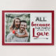 This romantic puzzle features the caption "All because two people fell in love", written in red and dark grey modern fonts on a white background, and decorated with tiny hearts and a grey arrow. You can customize it by adding your photo to the front.
