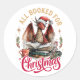 A festive and cheerful Christmas holiday design showcases a smiling red dragon wearing a Santa hat. The dragon stands behind a stack of books, engrossed in reading the top one. Beside the books are candy canes, pinecones, holly berries, and a steaming cup of cocoa. Golden stars surround the scene, while colourful text reads: "All booked for Christmas." This design is offered on a variety of products, making perfect gifts for book lovers.