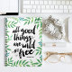 All good things are wild and free. Design features the quote in crisp black brushstroke text surrounded by jungle green botanical leaves in watercolor.