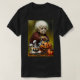 A ghostly elderly woman holds a pumpkin, while a skeleton takes a bath in a tea cup beside a carved jack-o'-lantern. The table scene with autumn leaves scattered around. Digital Art