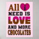 All I Need is Love and More Chocolates, this design features a bold pink and brown text saying "All I need is LOVE and more Chocolates". For all thise Chocolate lovers.