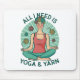 The phrase "Woman meditating with yarn, all I need is Yoga and Yarn" suggests that the woman finds both yoga and yarn crafting to be important aspects of her life. By combining the two activities, she is able to achieve a sense of relaxation, mindfulness, and creativity.