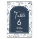 This All I Sea Is Love Dark Blue Seashells Table Number showcases a bold deep blue background filled with playful coastal doodles—seashells, starfish, hearts, sparkles, and waves. At the center, a solid dark blue arch with a thin white inner outline frames the editable text beautifully. Inside, the phrase “All I Sea Is Love” sits at the top, followed by a customizable line for names, a simple seashell illustration, and the table number. Dramatic, elegant, and entirely editable, it suits nautical weddings, evening ocean themes, and deep-sea–inspired celebrations.