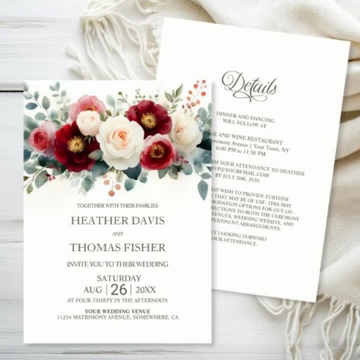 All in One Burgundy and White Floral Wedding Invitation