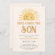 It features the text "Here Comes The Son" in stylish typography with a cute yellow watercolor sun on a soft cream background.