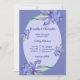 Pretty purple wedding card with lilac frame surrounded by purple and orange irises,the invitation is write in calligraphic font The back has an iris for the background and also the same oval frame embellished with small irises