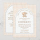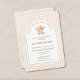 Host a sweet and memorable celebration with this We Can Bearly Wait baby shower invitation, featuring a soft beige gingham background, adorable teddy bear illustration, and elegant arched design. The coordinated back includes space for diaper raffle, books for baby, and registry details, making it both stylish and practical. Perfect for gender-neutral, minimalist, modern, and neutral baby shower themes. Fully customizable for your special event.