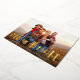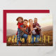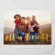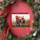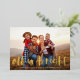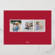 Festive holiday photo card features your favourite horizontal or landscape orientated photo in full bleed, with "all is bright" overlaid in gold foil hand lettered brush typography. Personalise the front of the card with your names and short holiday message (shown with "merry Christmas"), and add three additional photos to the back in a collage layout on a vibrant red background, along with a custom personal message. For a blank back, simply delete the photo templates and white mat layer.