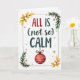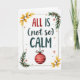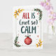 Spread holiday cheer with this charming Christmas card that is sure to bring a smile to your loved ones' faces 🎅🏼🎄🎁. The central image features a witty and playful twist on a classic carol lyric, reading "ALL IS (not so) CALM" in festive, hand-drawn lettering with vibrant red and deep green accents. The ornament hanging from the word "CALM" is a delightful red and white striped design, adding a touch of whimsy to the card. Surrounding the design are watercolor-style holiday greenery and yellow leaves, creating a cosy, rustic feel. Perfect for spreading laughter and joy during the busy holiday season, this card is a delightful way to share in the hustle and bustle with a warm heart.