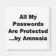 For the sarcasm lover in all of us. Check out this witty “All My Passwords are Protected....by Amnesia.” design on apparel, mugs, mousepads, buttons, and other unique gifts.