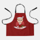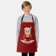 Kids' apron with an illustration of a cute smiling happy boy with ginger hair, the boy is wearing a Santa Clause costume with a red hat and holding a present, in a red circle; with a customisable text template for your child's name or message
