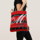 A stylish tote bag with your name and initials on a pattern background of large red stripes