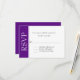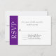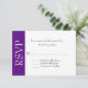Stylish event / wedding RSVP response card done in white, on the front, with a bold purple stripe, on the left side, with large white text reading RSVP. The back of the card is solid purple. All text is ready to personalise for your event.