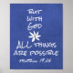 But with God, all things are possible bible verse posters and prints in deep blue with white typography and single white flower accent. Great for Sunday School, church or home. See more bible verse cases and scripture gifts at Christian Quotes. Link below: