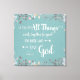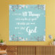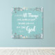 Canvas print with distressed white typography on textured aqua background surrounded by watercolor flowers, with well known verse from Romans 8:28, “… All things work together for good for those who love God…”