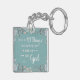 Acrylic key tag with distressed white typography on textured aqua background surrounded by watercolor flowers, with well known verse from Romans 8:28, “… All things work together for good for those who love God…”