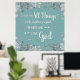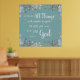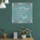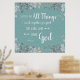 Poster with distressed white typography on textured aqua background surrounded by watercolor flowers, with well known verse from Romans 8:28, “… All things work together for good for those who love God…”