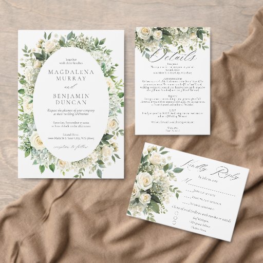 This elegant watercolor floral design features beautiful white hydrangeas, white roses, and fresh greenery with delicate baby's breath. Perfect for a classic white and green wedding or formal event.
