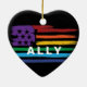 Social justice themed ornament features artistic LGBTQ rainbow brush stroke rainbow flag with customisable Ally text on black background