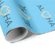 Blue wrapping paper with the word ALOHA with the O made from a heart of plumeria blooms on each side. Aloha means Love, Hello, and Goodbye in Hawaiian.