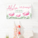 Aloha handwritten style typography script girl trendy Hawaiian luau birthday party sign backdrop banner featuring hot pink flamingo birds and green tropical leaves. +++++++++++++++++ Suitable for young girls or young women any age summer tropical themed, beach or by the sea birthday parties.