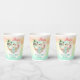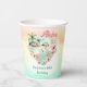 Tropical summer Hawaiian-themed party paper cups in pastel colours, featuring a tropical heart with a beach view, flamingos, and flowers with a rainbow-coloured background. Easily personalise the text. - Kate Eden Art