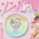 Tropical summer Hawaiian-themed party paper plates in pastel colours, featuring a tropical heart with a beach view, flamingos, and flowers with a rainbow-coloured background. Easily personalise the text. - Kate Eden Art