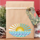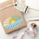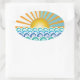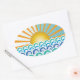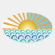 Oval sticker featuring design with different shades of blue waves with bright sun on white and blue horizon.