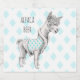 Whimsical drawing of an alpaca wearing boots and a vest with a turquoise diamond pattern against a pale turquoise diamond pattern background. A lovely illustration for animal lovers and those who love a warm, fuzzy feeling!