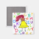 Cute whimsical childlike drawing of a little girl surrounded by letters of the alphabet.